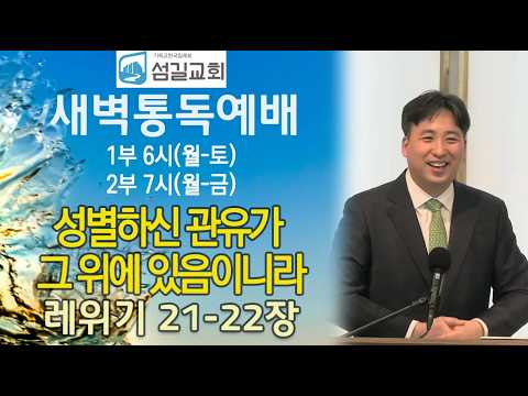 최근 영상 성별하신 관유가 그 위에 있음이니라 (레위기 21-22장) 2026년4월2일(목) 섬길교회 새벽통독예배 실황 1부 6시(월-토) / 2부 7시 (월-금) 박경준 목사2026.04.02 선지자 예레미야에게 하신 말씀을 듣지 아니하니라 (예레미야 37장강해설교) 섬길교회 수요저녁예배 2026년4월1일(수) 저녁7시30분 박경준 목사2026.04.01